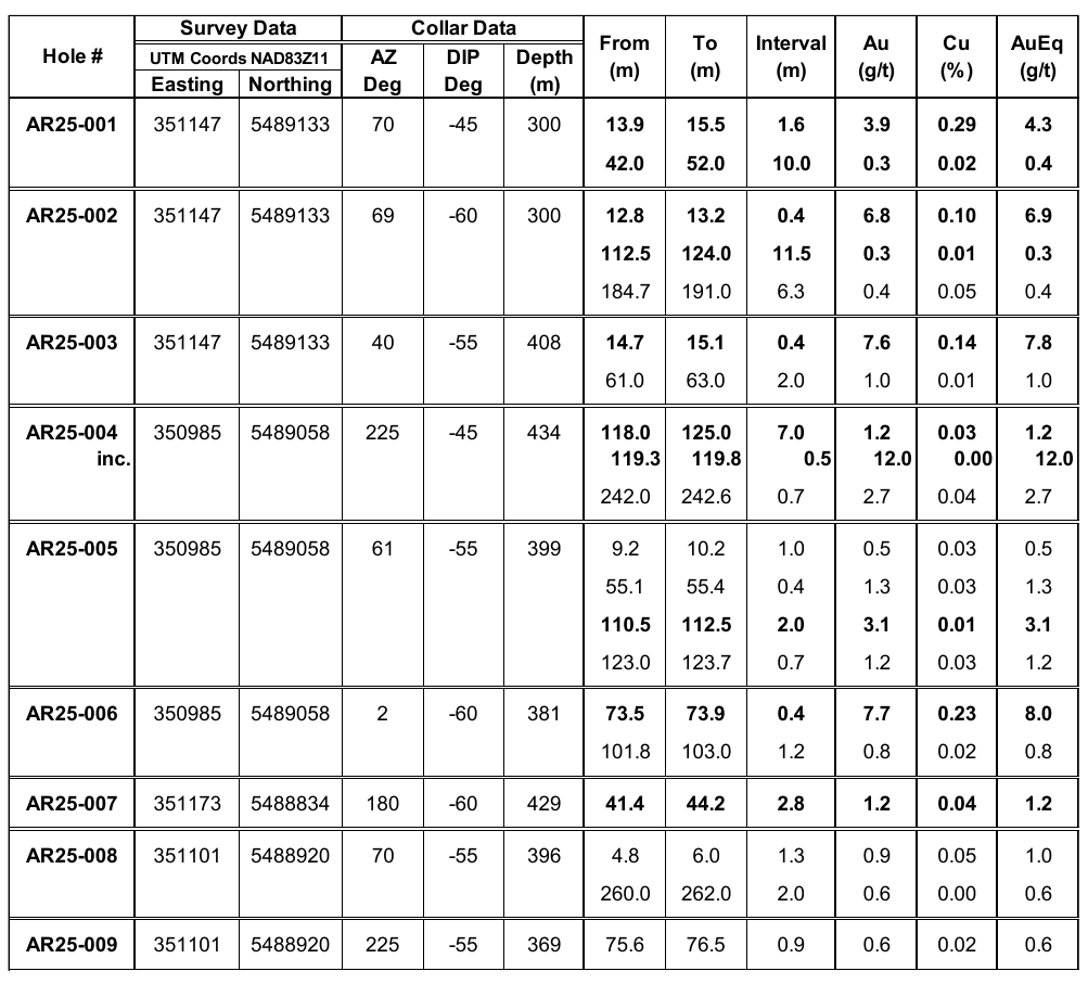 - A 1.6 metre interval averaging 3.9g/t Au, 0.29% Cu, (6.6g/t AuEq), from AR25-001;