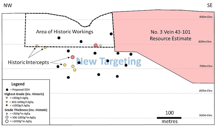Figure 2: Longitudinal Section of the No. 3 Vein North target, looking northeast, showing proposed drill targeting for the upcoming Fall ’24 drill program on the Silver Queen property