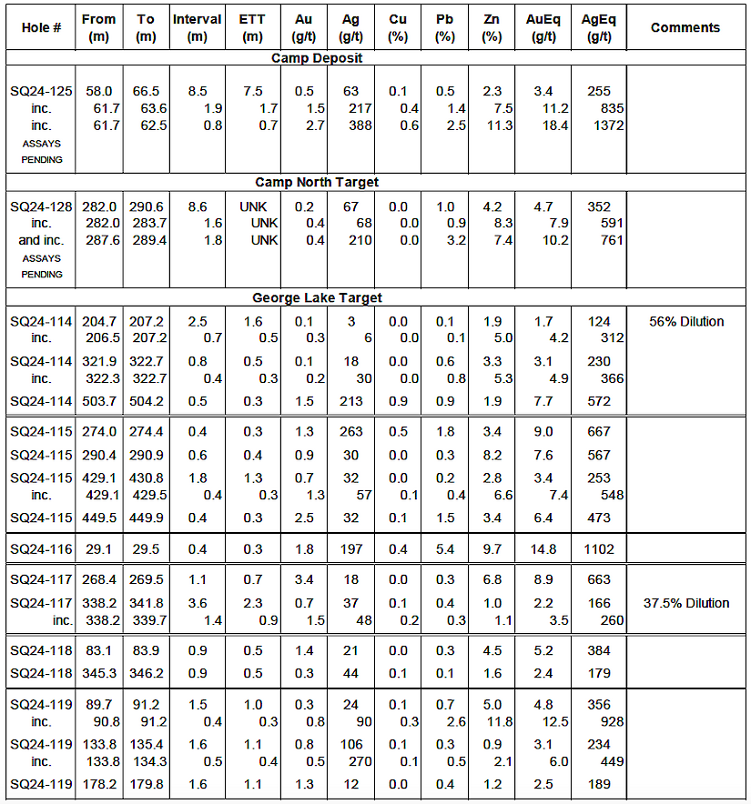 - A 0.7 metre (Est. TT) interval grading 2.7g/t Au , 388g/t Ag, 2.5%Pb and 11.3% Zn (18.4g/t AuEq or 1,372g/t AgEq) within a broader 7.5 metre (est. TT) interval averaging 0.5g/t Au, 63g/t Ag, 0.1% Cu, 0.5% Pb and 2.3% Zn (3.4g/t AuEq or 255g/t AgEq) in drillhole SQ24-125.