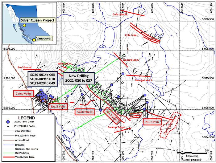 A total of 56 drill holes for 17,339 metres has now been completed by Equity Metals on the Silver Queen property in five successive phases of exploration drilling starting in late 2020. Five separate target areas have been tested and thick intervals of high-grade gold, silver and base-metal mineralization have been identified in each of the Camp Vein, No. 5, No. 3, and NG-3 Vein systems.