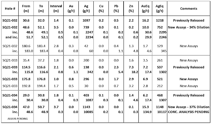 Full summary assay results are included below in Table 1. Assays from nine samples from drill hole SQ21-034 are pending, as is a concentrate analysis of the highlight 10,085g/t silver interval for verification purposes.