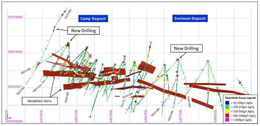 - a 0.7 metre (est. TT) interval grading 742g/t Ag, 0.7% Pb and 0.6% Zn ( 9.7g/t AuEq or 790g/t AgEq) from drill hole SQ23-082.