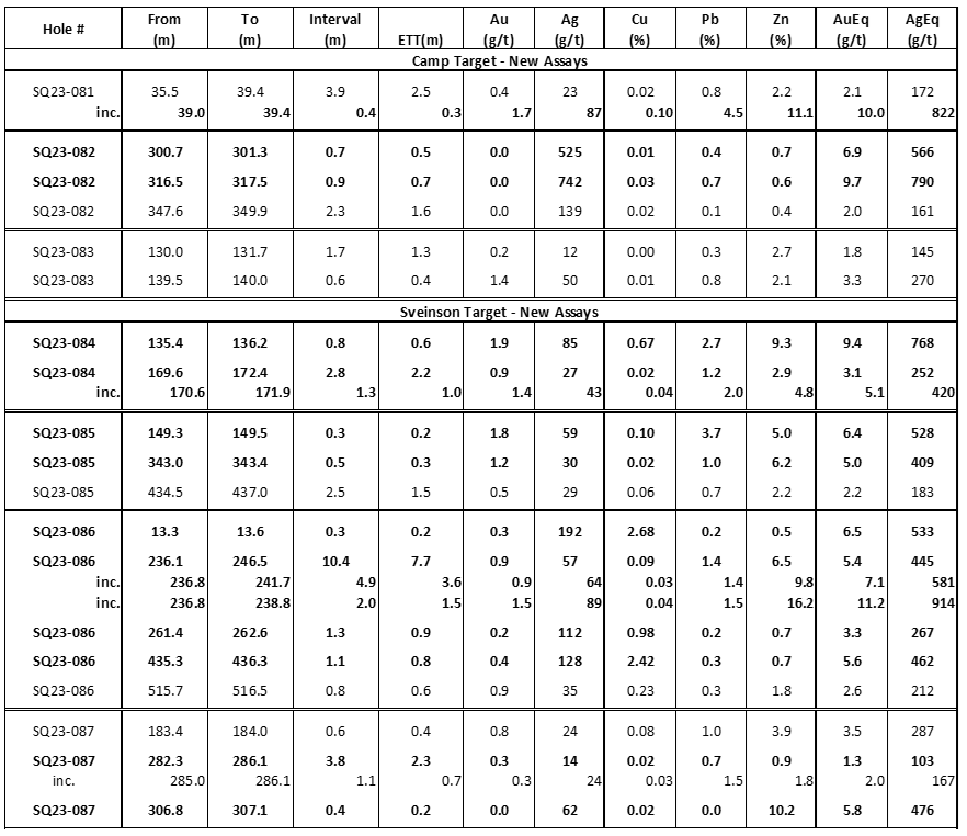 - a 2.2 metre(est. TT)interval grading 0.9g/t Au, 27g/t Ag, 1.2% Pb and 2.9% Zn (3.1g/t AuEq or 252g/t AgEq)from drillholeSQ23-084.