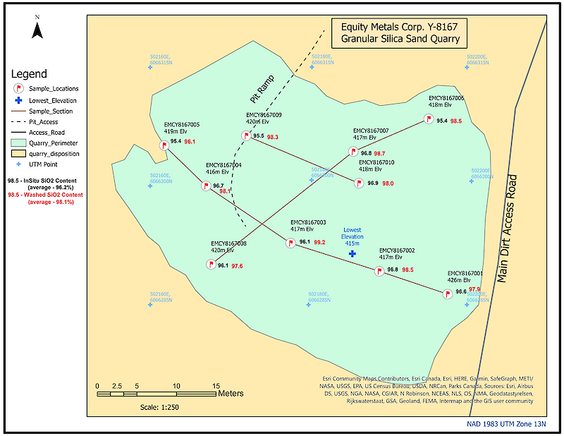 The Company acquired the lease as possible fracking sand; however, never mined the deposit. Historic mining was minimal and the extent of the silica deposit is open in all directions and at depth. Equity recognized the purity of the silica and its potential use as a low-cost material to produce silicon for the expected increase in demand due to electrification requirements. In October 2021, Equity initiated a sampling program to evaluate the deposit. Ten representative sites were sampled within the quarry, and sufficient material was collected to derive an average purity of the sand – see location of samples on the attached plan map of the quarry.