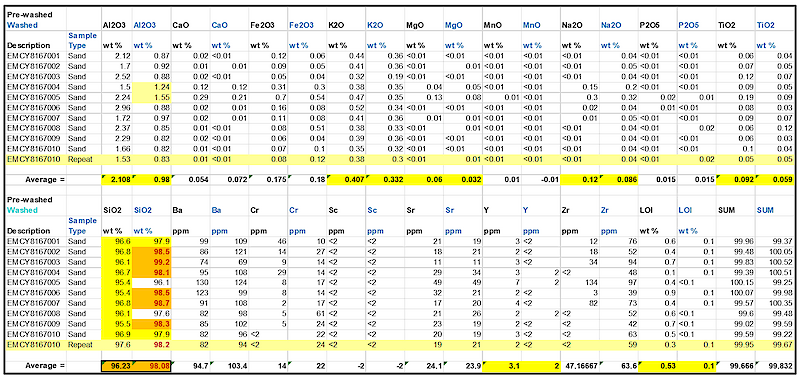 Table 1: Whole-rock analyses of pre- and post-washed samples, La Ronge Silica Quarry
