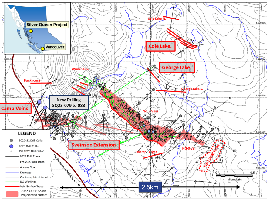 VP Exploration Rob Macdonald commented, “The current drill program follows on the release of an updated Mineral Resource Estimate for the Silver Queen property in December 2022, which successfully doubled the mineral resources on a silver-equivalence basis and with many mineralized blocks remaining open for further resource expansion. This new drilling confirms the continued extension of high-grade silver mineralization and the identification a new vein in the Camp Target. In addition, we have encountered encouraging visuals from offset drilling along the Sveinson Target. Multiple veins remain to be tested on the property and that process will start again with the next phase of drilling scheduled to begin in early summer.”