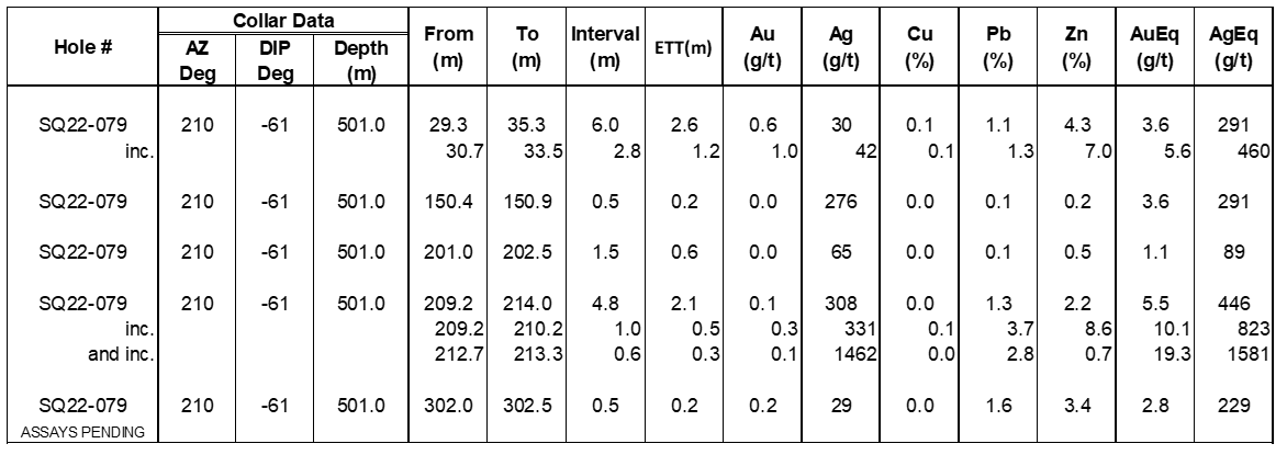 - A deeper 0.3 metre interval (est. TT) grading 0.1g/t Au, 1,462g/t Ag, 2.8% Pb and 0.7% Zn (19.3g/t AuEq or 1,581g/t AgEq) within a 2.1 metre interval averaging 0.1g/t Au, 308g/t Ag, 1.3% Pb and 2.2% Zn (5.5g/t AuEq or 446g/t AgEq) from drillhole SQ22-079.