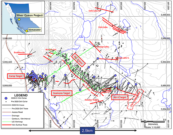 - A total of 78 drill holes for 25,659 metres was completed by the Company on the Silver Queen Project in six successive phases of exploration starting in late 2020. Five separate target areas have been tested in part and thick intervals of high-grade gold, silver and base-metal mineralization have been identified in each of the Camp Vein, the Svenson Target, No. 3 Vein, and NG-3 Vein systems.