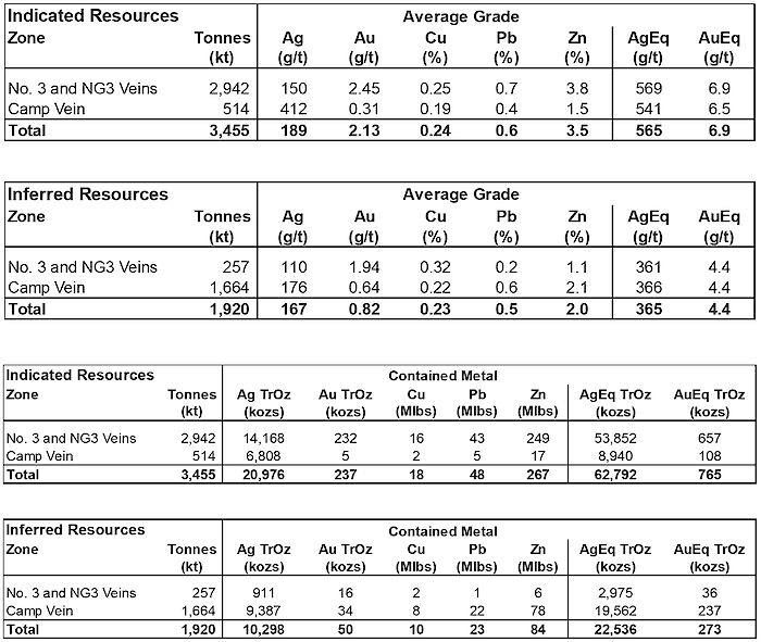 - A 2.6Mt increase in Indicated Mineral Resources to 3.46Mt averaging 189g/t Silver, 2.13g/t Gold, 0.24% Copper, 0.6% Lead and 3.5% Zinc (565g/t AgEq or 6.9g/t AuEq) containing: