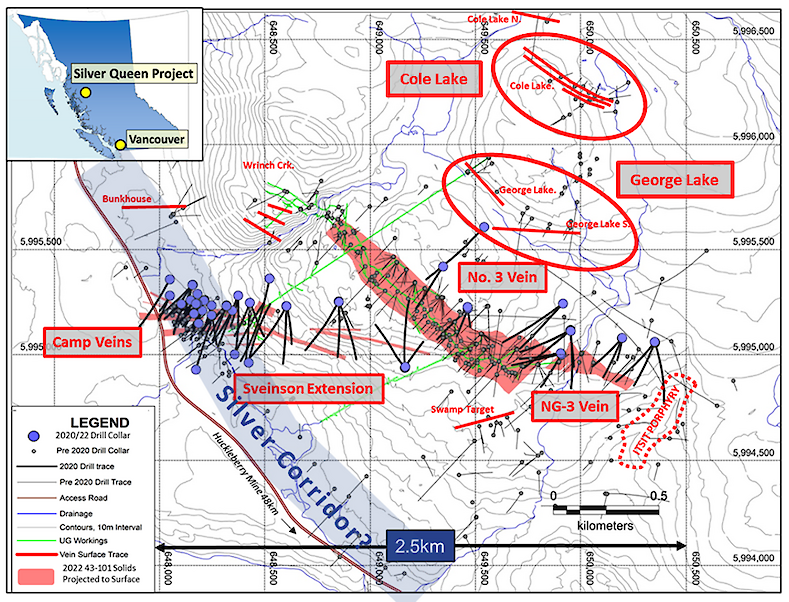 VP Exploration Rob Macdonald commented, “The current drill program follows on the release of an updated Mineral Resource Estimate on the Silver Queen property in December 2022, which successfully doubled the mineral resources on a silver-equivalence basis with many mineralized blocks remaining open for further resource expansion. Over 20 different veins have been identified on the property, many with encouraging drill intercepts that have not been properly offset. Mineral Resources have been defined on only four veins leaving extensive exploration potential remaining on the property.”