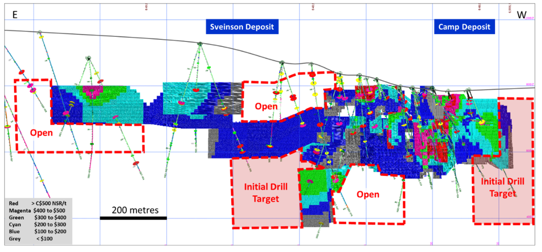 Figure 2: Sveinson and Camp targets, looking south. Initial drilling in 2023 will test the western extension of the Camp target and then down-dip projects of the Sveinson target.