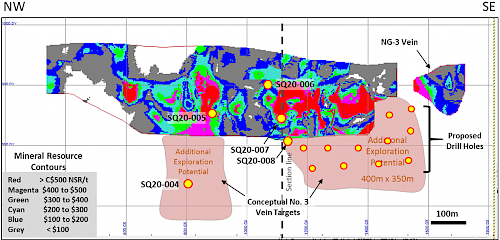 Figure 1. Longitudinal Section of the No. 3 & NG-3 veins showing NSR distribution, pierce-points of the 2020 current and 2021 Phase III drill holes.