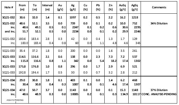 Table 1: Recently Reported Drill Intercepts from 2021 Drilling on the Camp Vein Target, Silver Queen Property, see NR-13-21.