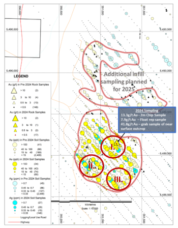 Figure 1: Three target areas identified by clusters of gold and silver assay results from rock and soil sampling on the Fresh Pots target, Arlington property. Note the brighter colours represent gold and silver assays results from the 2024 sampling while the paler colours represent pre-2024 sample results.
