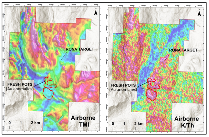 The Fresh Pots soil anomaly is further characterized by a prominent magnetic low and an elevated K/Th radiometric signature identified in an airborne magnetic/radiometric survey flown over the entire 5,387ha Arlington property in January 2025 (Figure 2).