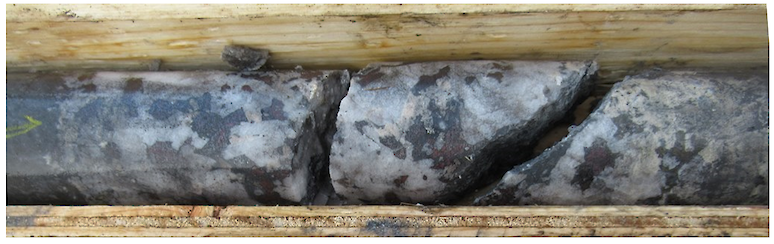 Figure 1: Quartz-barite vein with “Ruby Silver” mineralization, from ~112.8m to 113.1m in hole SQ20-010, Camp Vein target, Silver Queen property