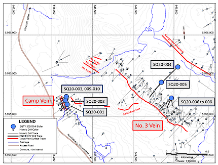 Drill hole SQ20-010 is one of five core holes totaling 864.8 metres which tested the Camp Vein system as part of the current exploration program. Assays are reported as downhole thickness until further modelling can confirm the orientation of the veining.