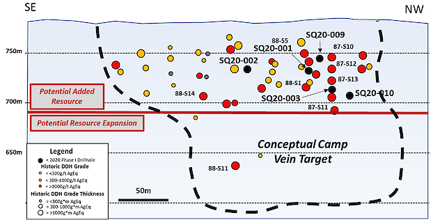 The mineralized intercept is a 50m step-out from previously reported mineralization in hole SQ20-003 (7m downhole grading 656g/t AgEq – see NR-11-20) and an approximate 15m step out from mineralization in historic hole 87-S11, which reportedly included a 0.46m downhole interval grading 14,400g/t Ag, within a 3.1m interval averaging 2,422g/t AgEq. All three mineralized intercepts are relatively shallow, occurring within 85m of the surface (see Figure 3 – Camp Vein longitudinal section).