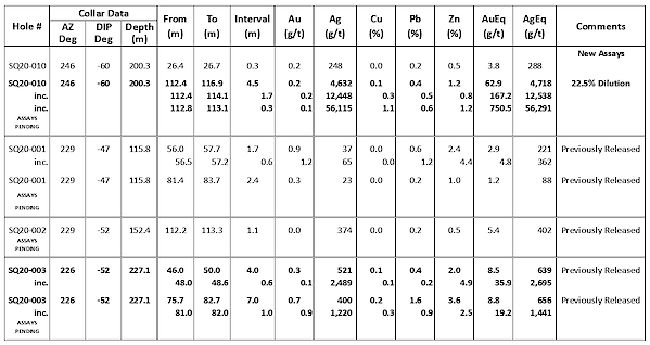 - a 0.3 metre downhole interval grading 56,115g/t Ag, 0.2g/t Au, 1.1% Cu, 0.6% Pb and 1.2% Zn (56,291g/t AgEq or 750.5g/t AuEq) within a broader 1.65 metre downhole interval averaging 12,448g/t Ag, 0.3g/t Au, 0.3% Cu, 0.5% Pb and 0.8% Zn (12,538g/t AgEq or 167.2g/t AuEq) from 112.4m to 114.1m down hole in SQ20-010.