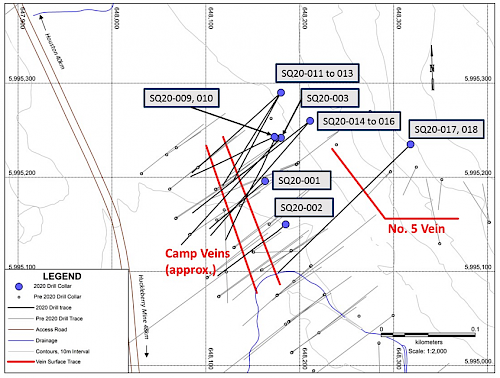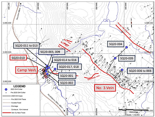 Additional assay results from drill hole SQ20-009, which tested the Camp Vein target are pending and will be released upon receipt.