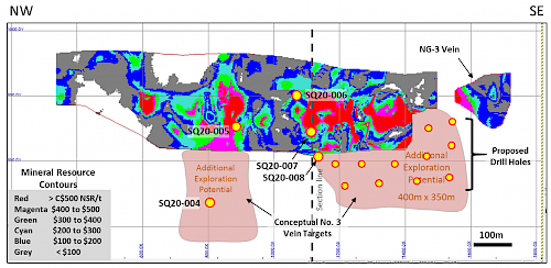 Assay results from a third hole, SQ20-004, which tested the No. 3 Vein 150 metres down-dip of the known mineral resource and on the same section as drill hole SQ20-005, intersected a 0.5m interval grading 2.3g/t Au, 46g/t Ag, and 1.1% Zn (3.6g/t AuEq or 267g/t AgEq) within a broader 42m interval of anomalous gold-silver-zinc. The intercept confirms the downdip projection of the No. 3 Vein, opening an entirely new section of the Number 3 vein to be tested beneath the current mineral resource and above drill hole SQ20-004.