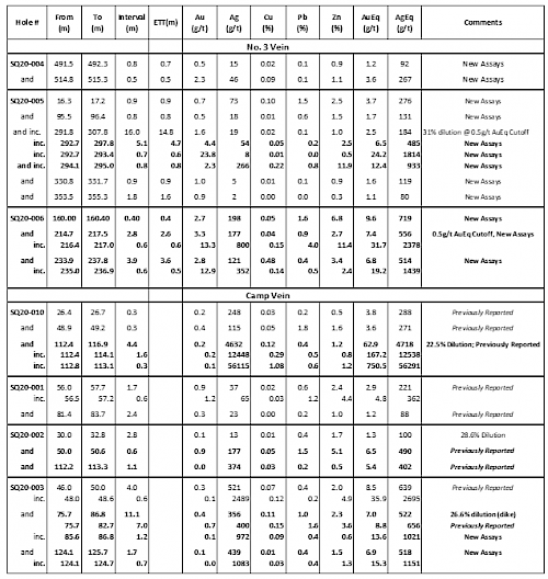 - a 0.6 metre down-hole interval (0.6m est TT) grading 13.3g/t Au, 800g/t Ag, 4% Pb and 11.4% Zn (9.6g/t AuEq or 719g/t AgEq) within a broader 2.8m down-hole interval (2.6m est TT) averaging 3.3g/t Au, 177g/t Ag, 0.9% Pb and 2.7% Zn (7.4g/t AuEq or 556g/t AgEq) from drill hole SQ20-006 that occurs in the hangingwall of the No. 3 Vein; and