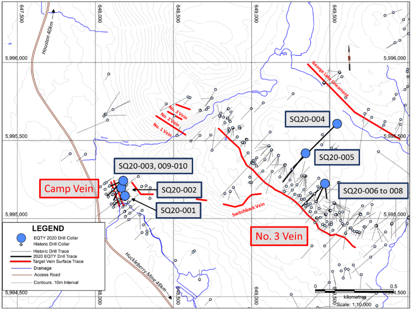 Hole SQ20-003 is one of five core holes totaling 864.8 metres that tested the Camp Vein system as part of the current exploration program. The holes were designed to verify results of historic drilling from the 1980’s and to test prior 3D modelling of the historic drilling completed during Equity’s earlier compilation work on the project. Assays are reported as downhole thickness until further modelling can confirm the orientation of the veining.