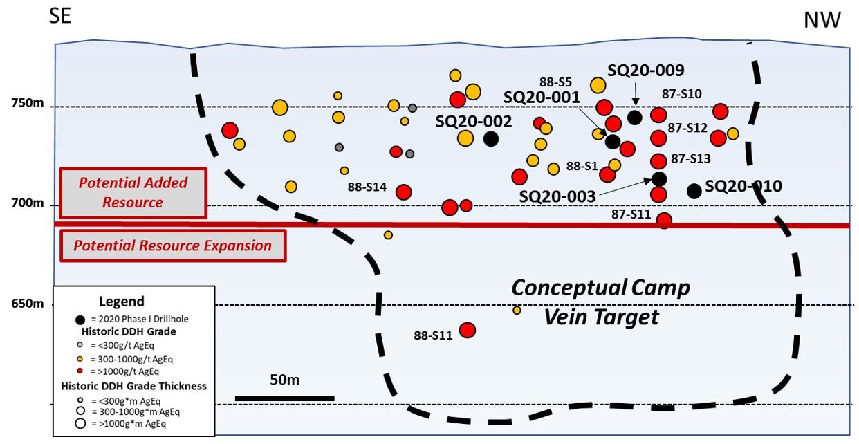 - a 1.1 metre downhole interval averaging 374/t Ag, 0.2% Pb and 0.5% Zn (402g/t AgEq or 5.4g/t AuEq) from hole SQ20-002.