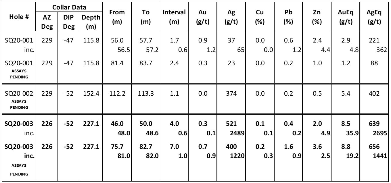 - a 1.7 metre downhole interval averaging 37/t Ag, 0.9g/t Au, 0.6% Pb and 2.4% Zn (221g/t AgEq or 2.9g/t AuEq) from hole SQ20-001; and
