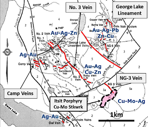 The Silver Queen Property consists of 45 mineral claims, 17 crown grants, and two surface crown grants totalling 18,852ha with no underlying royalties. Mineralization is hosted by a series of epithermal veins distributed over a 6 sq km area. Most of the existing resource is hosted by the No. 3 Vein, which is traced by drilling for approximately 1.2km to the southeast where it transitions into the NG-3 Vein close to the Itsit porphyry area. Over 20 different vein structures have been identified on the property, forming an extensive network of zoned Cretaceous- to Tertiary-age epithermal veins. The property remains largely under-explored.