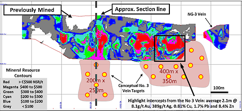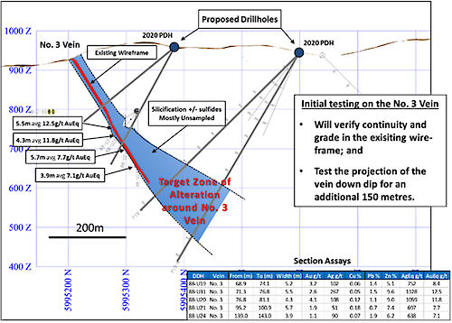 Figure 3: Cross section through the No. 3 Vein showing high-grade mineralization within the existing wire frame, the locally extensive alteration halo surrounding the vein and the down-dip projection of the No. 3 Vein to be tested in 2020. Highlighted mineral intercepts are reported as down-hole thickness.