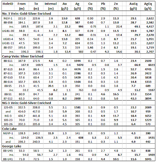 Table 1: Select Historical Drill Intercepts from the No. 3, Camp, NG-3, Cole and George Lake veins on the Silver Queen Property.