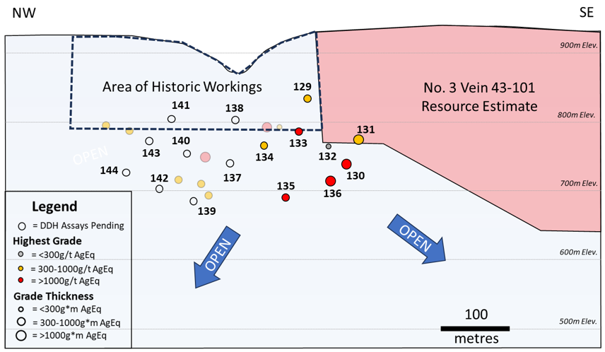 VP Exploration Rob Macdonald commented, “This northern extension of the No. 3 Vein is a new target area for the Company and drilling from 2024 could potentially extend the projection of the vein system a further +300 metres to the northwest from what is currently modelled. Mineralization remains open both laterally and at depth and is immediately adjacent to, and down dip from, existing historic underground workings, which would likely reduce development costs in an underground mining scenario. Further assays from the drilling are pending and are anticipated in the coming weeks. ”