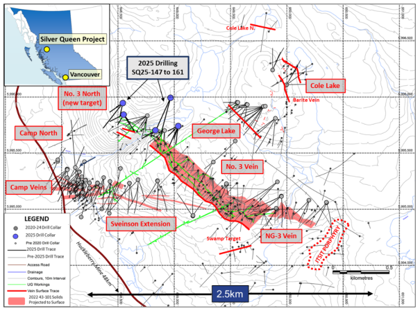 Drilling in 2025 continues to confirm the grade, tenor and lateral extension of mineralization beyond the northern end of the No. 3 Vein resource model. Fifteen core holes totalling 5,040 metres have been completed to date of a planned 6,000 metre program. Work in 2025 will continue to incorporate the new drill data into revised exploration and resource models, in anticipation of a Mineral Resource update to be prepared in late 2025, and to continue exploration drilling on the ever-expanding Silver Queen vein system into 2026.