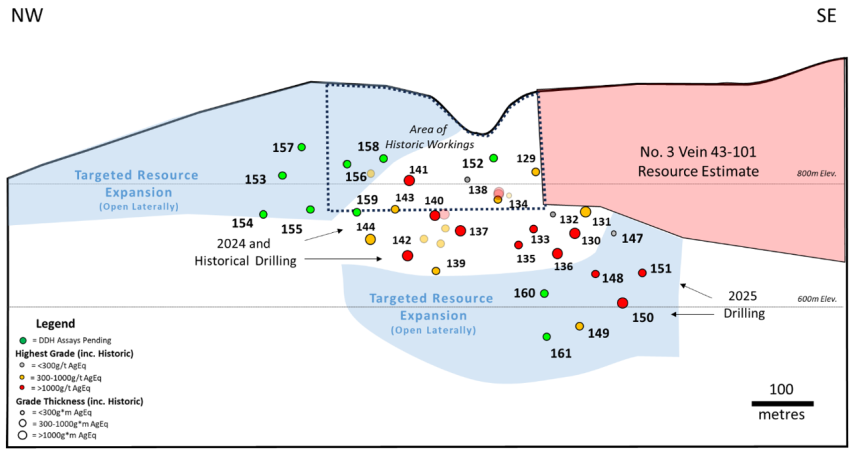 These results represent the first set of intercepts from drill targets that tested down-dip of previously reported mineralization identified in 2024 drilling. Mineralization along this 150-metre segment has now been extended to over 350 metres below surface, and drilling confirms the down-dip continuity of the No. 3 Vein in this area. Several additional veins have been intersected in drilling and include a copper-enriched hanging wall vein and deeper vein intercepts that correlate with the No. 2 vein, which is described in historical records and was intersected in 2024 drilling. All of the veins remain open for further delineation and extension.