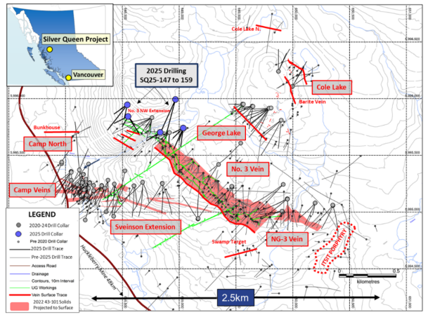 Twenty-one core holes totalling 8,059 metres were drilled on the No. 3 North target. A short surface program consisting of reconnaissance soil and stream sediment sampling is currently underway to investigate several district-scale targets outboard from the No. 3 Vein system. Work in 2025 will continue to incorporate the new drill data into a revised exploration and resource model, in anticipation of a Mineral Resource update to be prepared in late 2025, and to continue exploration on the ever-expanding Silver Queen vein system into 2026.