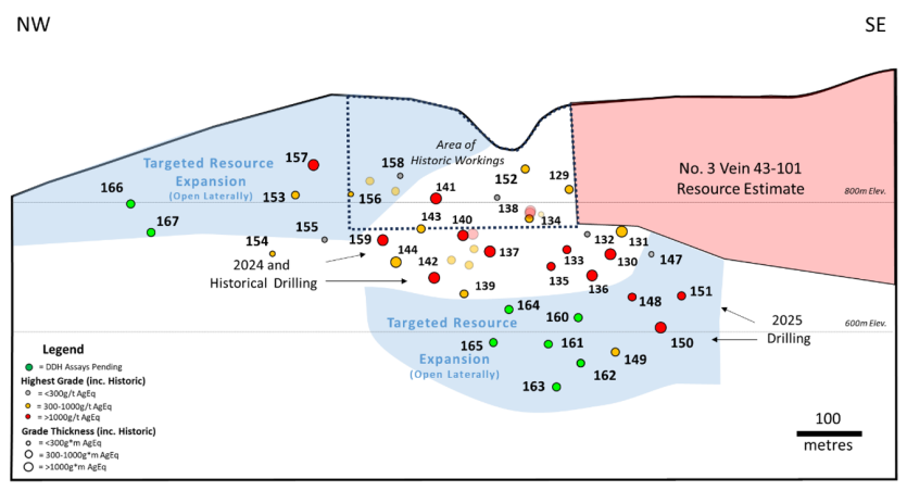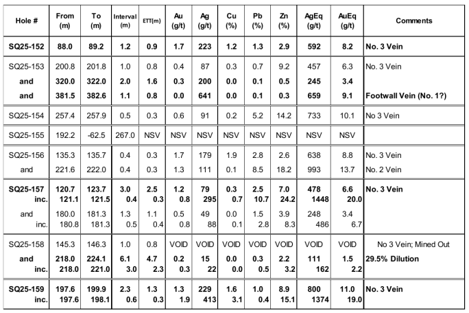 - A 0.8 metre (Est. TT) interval grading 641g/t Ag, 0.1% Pb and 0.3% Zn (659g/t AgEq or 9.1g/t AuEq) in SQ25-153 from a footwall vein that may correlate to the No. 1 Vein, which was previously identified in historical drilling but not specifically targeted during this round of drilling.