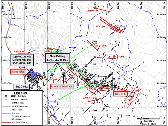 In October through December 2021, 14 holes totaling 5,024 metres tested the 1,000 metre-long region between the Camp veins and the No. 3 Vein with wide-spaced drilling, as an initial test of the area now referred to as the Sveinson Extension (includes the No. 5 and Switchback veins; see Figure 1). A final hole, SQ21-049, has tested the footwall of the Camp Vein target. Full assays from 26 of these holes are pending with further assay results expected over the coming weeks and extending into the New Year.