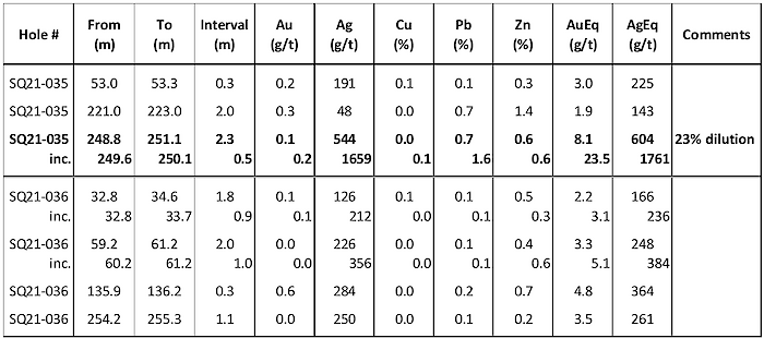 - a 0.5 metre interval grading 1,659g/t Ag, 0.1g/t Cu, 1.6% Pb and 0.36% Zn (1,761g /t AgEq) within a 2.3 metre interval averaging 554g/t Ag, 0.7% Pb and 0.6% Zn (604g/t AgEq) from drill hole SQ21-035; and