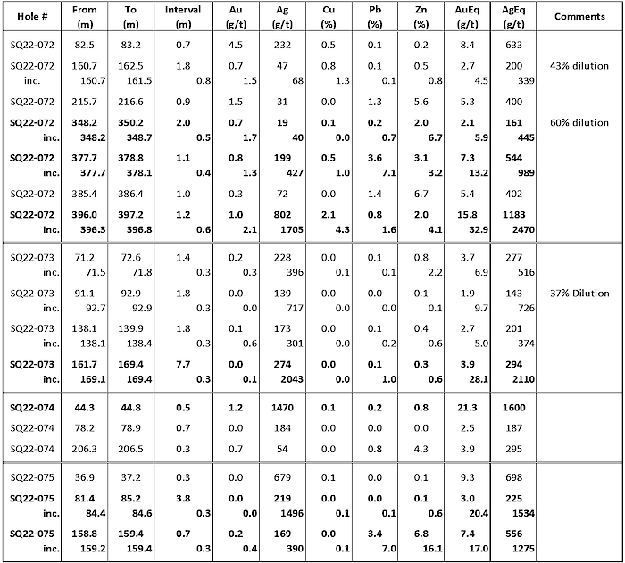 - a 0.6 metre interval grading 2.1g/t Au, 1,705g/t Ag, 4.3% Cu, 1.6% Pb and 4.1% Zn (32.9g/t AuEq or 2,470g/t AgEq) within a 1.2 metre interval averaging 1.0g/t Au, 802g/t Ag, 2.1% Cu, 0.8% Pb and 2.0% Zn (15.8g/t AuEq or 1,183g/t AgEq) from drillhole SQ22-072;
