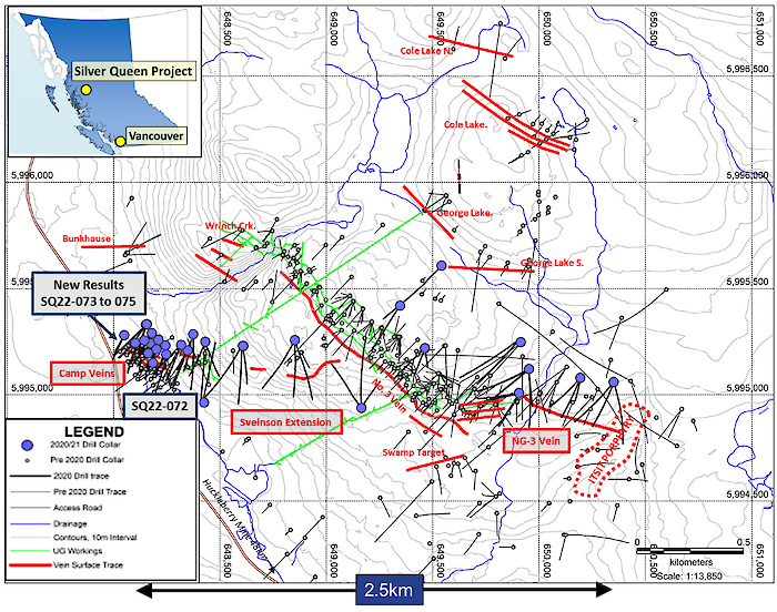 VP Exploration Rob Macdonald commented, “These results mark the completion of the Winter ’22 drill program on the Silver Queen project, which successfully confirmed a 300 metre projection of the NG-3 vein to depths of up to 390 metres below surface; identified the western and currently open-ended projection of the Camp Vein target; and confirmed the continuity of several gold-silver-mineralized structures in the transition eastward from the Camp Vein into the Sveinson target. Compilation of this and earlier data continues toward the preparation of a mineral resource update in the coming months. Numerous veins remain open for testing across the 6 sq. km. target area, which will form the basis of additional drill testing in 2022.”