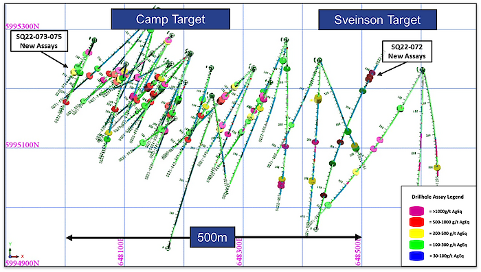 A fourth hole (SQ22-072) tested an approximate 200 metre width of the Sveinson target, intersecting three main clusters of mineralized veins to depths of up to 335 metres below surface. These represent significant step-outs from previously drilled intercepts in the western portion of the Sveinson target. Intercepts are generally more gold-enriched than intercepts in the Camp Vein and return higher base metal contents.