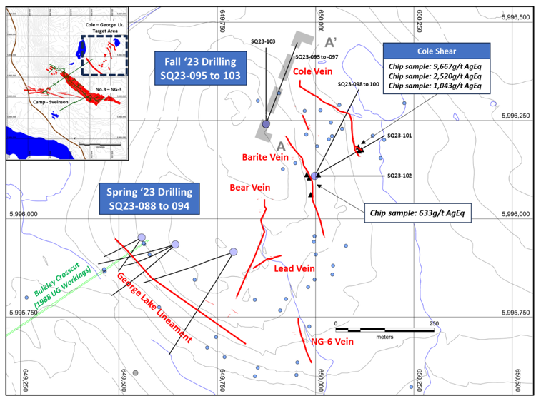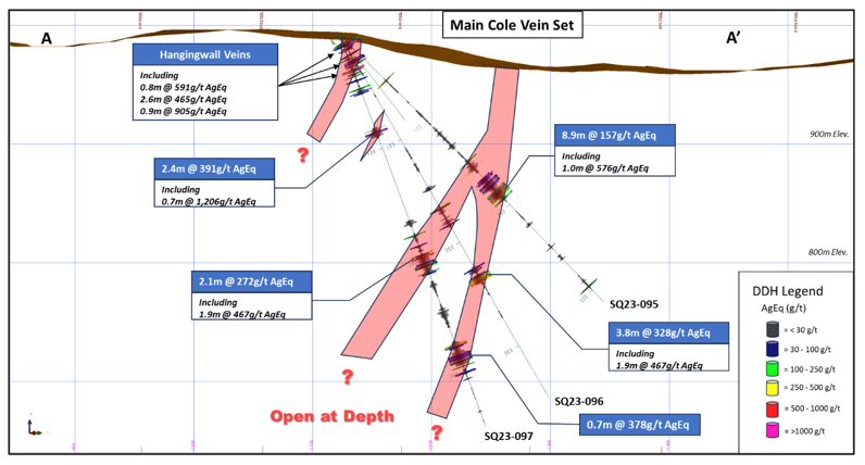 - A 1.9 metre (est. TT) interval averaging 0.2g/t Au, 325g/t Ag, 0.2% Cu, 1.2% Pb and 1.6% Zn (5.7g/t AuEq or 467g/t AgEq) within a 3.8 metre (est. TT) interval averaging 0.2g/t Au, 212g/t Ag, 0.2% Cu, 0.9% Pb and 1.3% Zn (4.0g/t AuEq or 328g/t AgEq) from the Cole Vein in drillholeSQ23-096; and