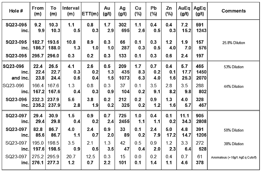- A 1.0 metre (est. TT) interval averaging 1.0/t Au, 287g/t Ag, 0.3% Cu, 0.5% Pb and 4.0% Zn (7.0g/t AuEq or 576g/t AgEq) within an 8.9 metre (est. TT) interval averaging 0.3g/t Au, 66g/t Ag, 0.1% Cu, 0.3% Pb and 1.2% Zn (1.9g/t AuEq or 157g/t AgEq) from the Cole Vein in drillhole SQ23-095;