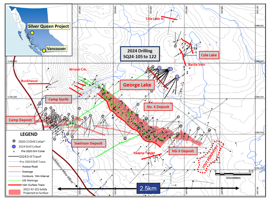 Equity Reports Initial 2024 Drill Results from the George Lake Target at the Silver Queen Project, BC and includes 8.8 metres (est TT) of 324g/t AgEq with 1.2 metres (est TT) of 1189g/t AgEq in Hole SQ23-105