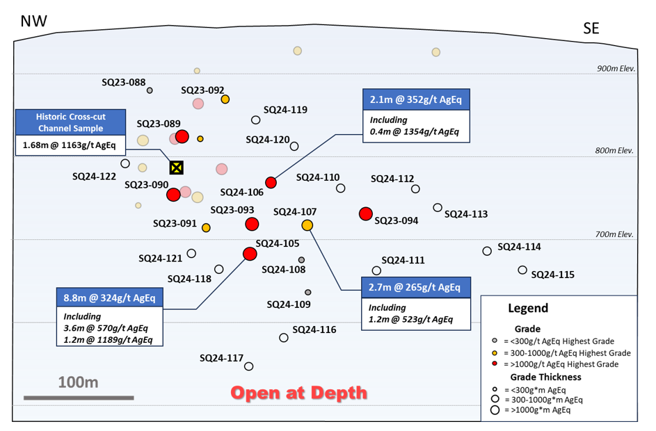 Drill hole SQ24-105 returned the thickest intervals of mineralization identified from the George Lake structure to date, which remains open to depth. Drill hole SQ24-106 (see long section attached as Figure 2) successfully tested the target vein up-dip of the SQ23-93 intercept and remains open to surface (approximately 150 metres). Additional narrower veins were intersected in each of the five holes suggesting the potential, with further drilling, for the development of hangingwall/footwall zones to, or splays from, the main vein; these include: 0.2m (est. TT) grading 1282g/t AgEq from drill hole SQ24-108 and 0.7m (est. TT) averaging 418g/t AgEq from SQ24-109.