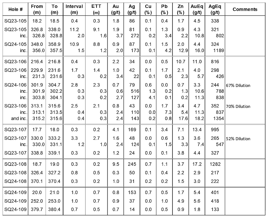 - A 1.6 metre (est. TT) interval grading 3.7g/t Au, 272g/t Ag, 0.2% Cu, 3.4% Pb and 2.2% Zn (10.8g/t AuEq or 802g/t AgEq) within a 9.1 metre (est TT) interval grading 1.9g/t Au, 81g/t Ag, 0.1% Cu, 1.3% Pb and 0.9% Zn (4.3 AuEq or 321g/t AgEq) alsoin drillhole SQ23-105,and