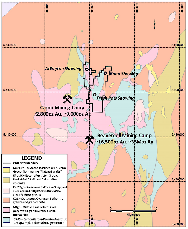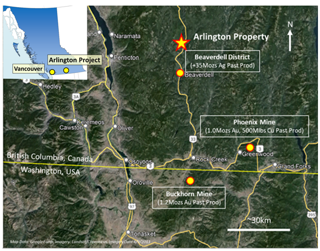 The Arlington Au-Cu-Ag Property is located in the West Kettle River Valley in southern British Columbia; it is 17 km north of the community of Beaverdell and 65 km south of Kelowna B.C., within the Greenwood Mining Division (see Figure 1).