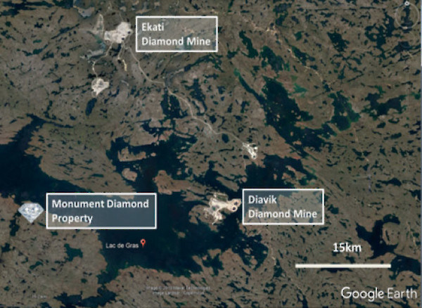 The Monument Property is strategically located on the south shore of Lac De Gras, NWT. Kimberlites of the Monument Property form part of the Lac de Gras cluster and occur within 40 km of both the Ekati Diamond Mine and Diavik Diamond Mines Ltd., which together produce a noteworthy percentage of the world’s diamond production.