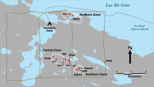 Northern Zone: The Trio and DD42 string are in the north on the south shore of Lac de Gras. The DD42a is the most westerly and most recent under water target tested of the DD42 string of geophysical targets. A further winter program is necessary to test the remaining targets and acquire kimberlite for diamond content and analyses.